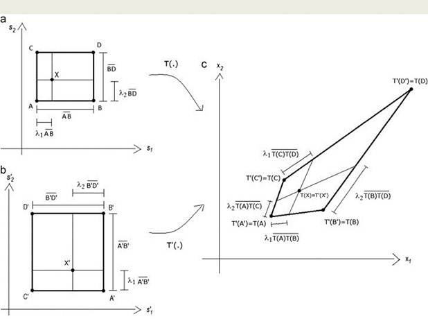 transform by two bi-affine transformation to the same point (T(X)=T’(X’)),