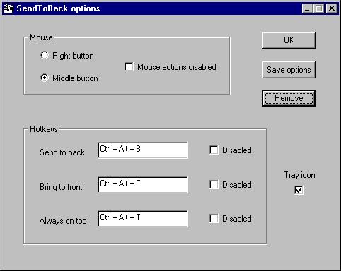Sending a window to the back can be done by means of the right-hand or the middle mouse button, at the user's choice, as well as by means of a hotkey. The other two actions are performed by means of hotkeys.